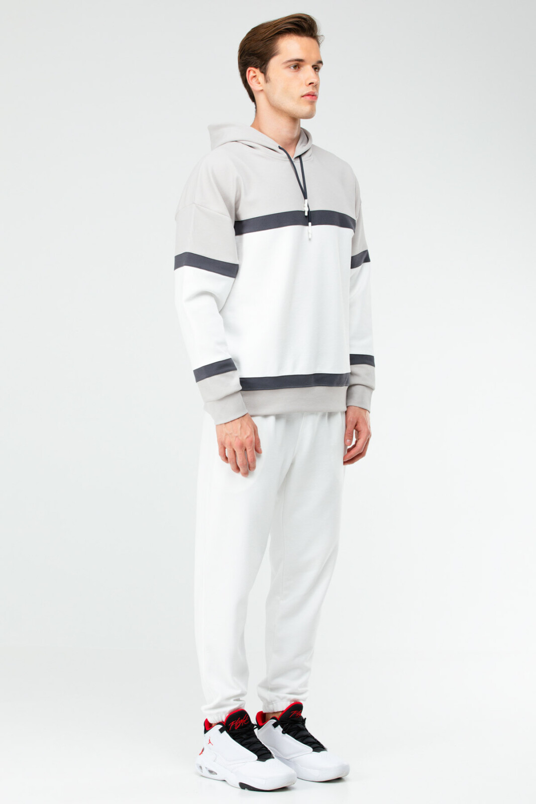 Yüksek kaliteli pamuklu kumaşı sayesinde konforlu ve rahat bir kullanım sunar. Oversize kesimi, modern ve şık bir görünüm sağlar. Üst ve alt takım, vücut hatlarını özgürce sarar.